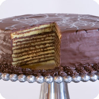 Imagine nine of the most delicate layers of spongy yellow cake separated by the thinnest layers of an old fashioned cooked chocolate icing that sets like fudge.
